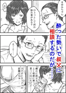 キスをして胸を揉んでいると、さすがにまゆみが目を覚ますが、エッチで気持ちよくなりたいんでしょと言って叔父さんは嫌がる姪を無視して感じさせていく。気持ちよくなってきて叔父さんを拒めなくなったまゆみは、全身を愛撫されて感じ、叔父さんが挿れるのを戸惑いながらも受け入れてしまう。